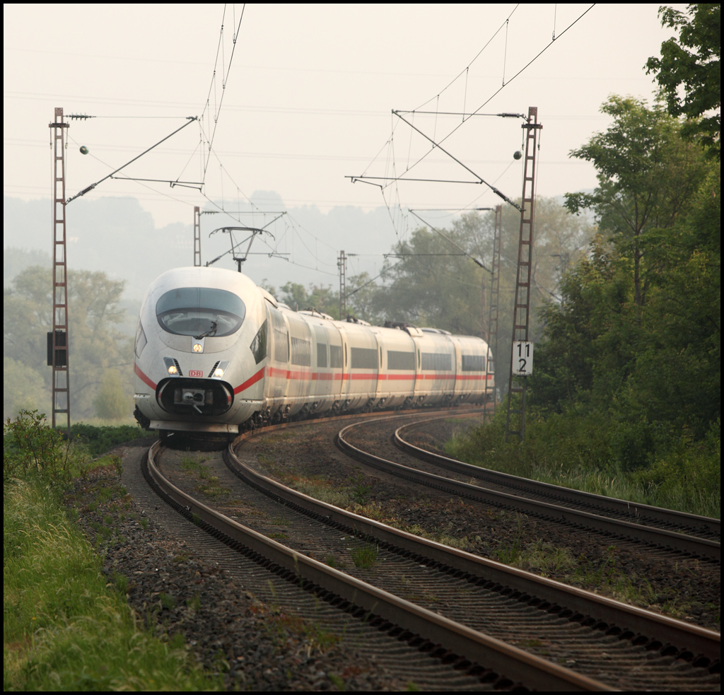 Dieser unbekannte 403er durchfährt am Morgen des 21.05.2011 die Ruhrwiesen zwischen Witten und Wetter(Ruhr) als ICE 503 auf der Reise von Hannover Hbf via Hagen nach Basel SBB.
