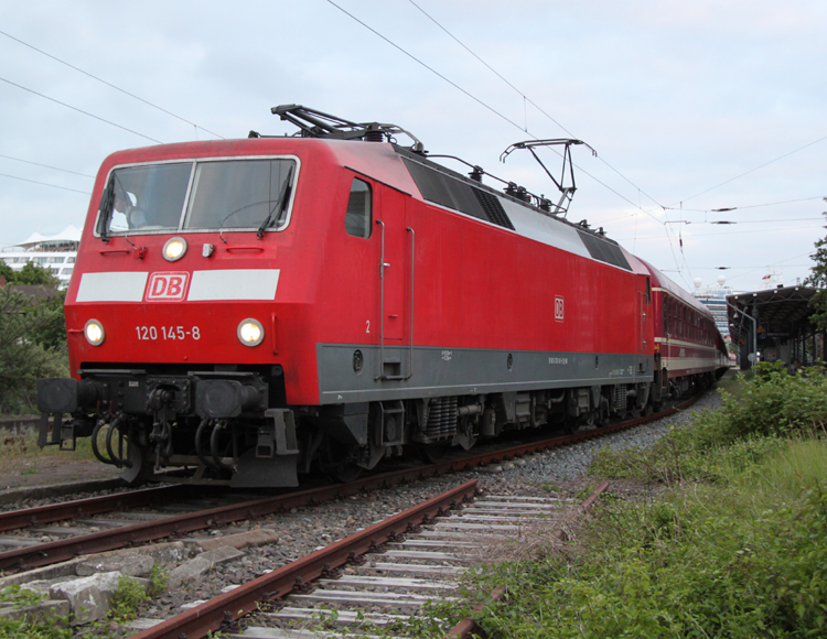 120 145-8 mit DZ2673 von Berlin Gesundbrunnen nach Warnemünde kurz nach der Ankunft um 20.16 Uhr im Bahnhof Warnemünde.(27.05.2011)