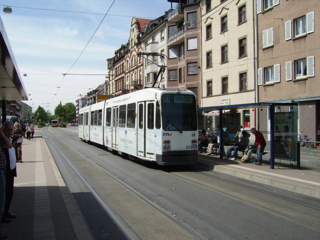 Eine RNV Variobahn die sich leicht in die Kurve in Heidelberg legt am 09.05.11