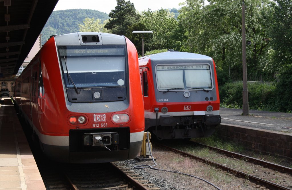 Hier links 612 661 und 612 013 als RE4 von Hannover Hbf. nach Halle(Saale) Hbf. und rechts 628 563 als RB14265 von Bad Harzburg nach Braunschweig Hbf., diese beiden Triebzüge standen am 22.5.2011 in Bad Harzburg