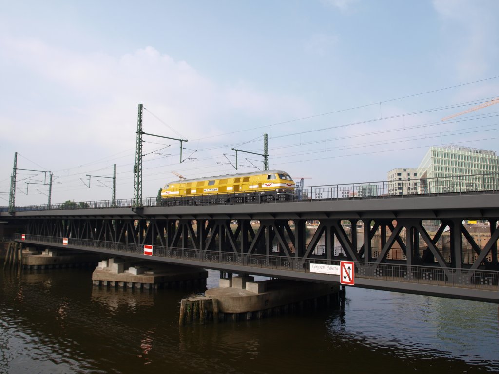 Nanu, was kommt denn da angebrummt? Die Überraschung des Tages schlechthin bildete die V 320 001 der Fa. Wiebe auf der Hamburger Oberhafenbrücke in Richtung Hbf am 21.05.2011.