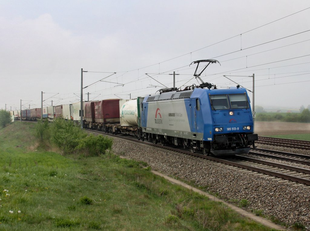 Die 185 513 am 28.04.2011 mit einem KLV-Zug unterwegs bei Hebertshausen.