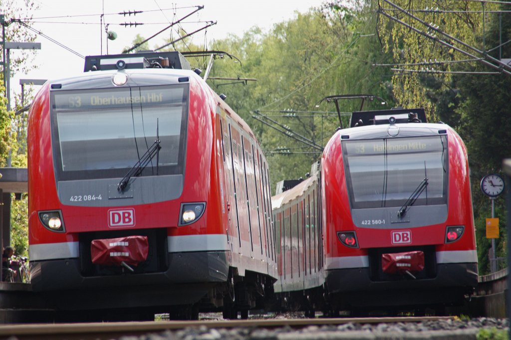 Wärend rechts der 422 080 mit der S3 nah Hattingen-Mitte auf Ausfahrt wartet fährt links 422 084 "Essen" mit der S3 nach Oberhausen Hbf aus.Aufgenommen am Bahnhof Essen-Horst neben der Bushaltestelle.