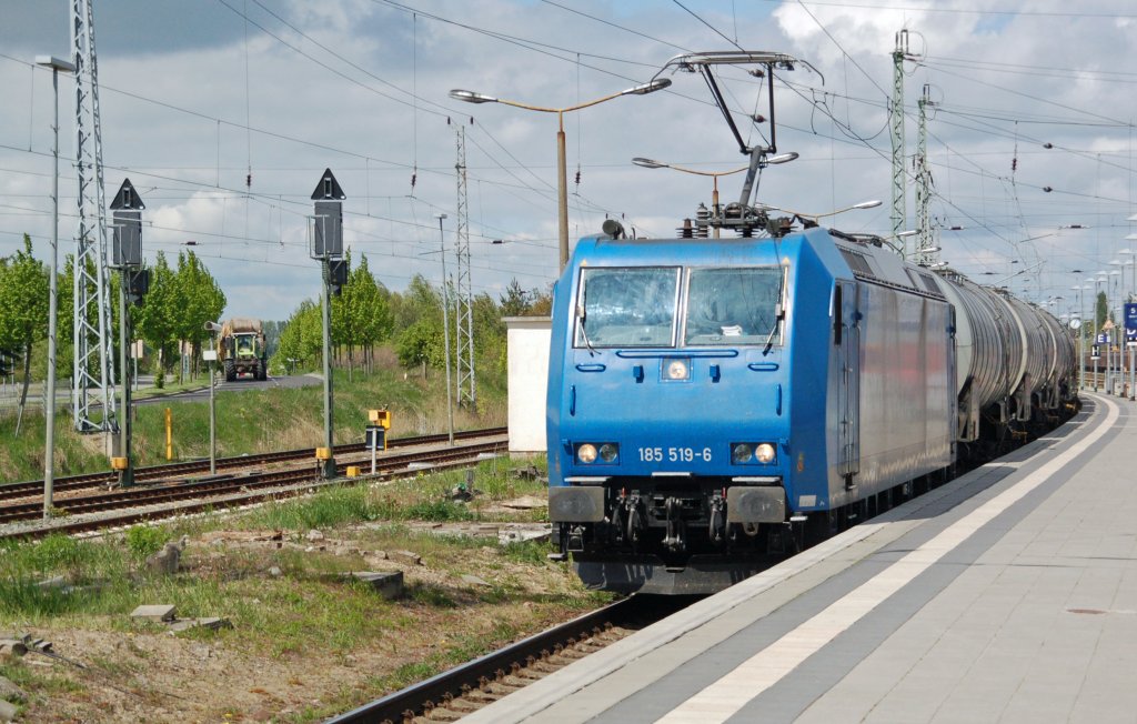 185 519 zieht am 04.05.11 einen Kesselwagenzug durch Angermünde Richtung Eberswalde.