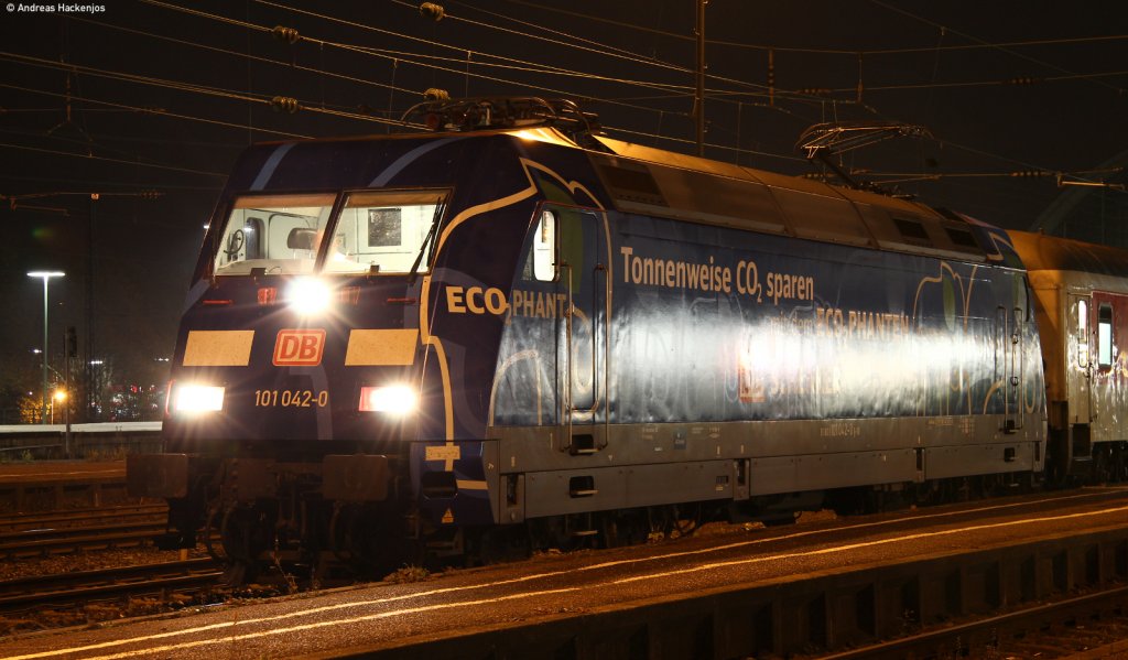 101 042-0 "Ecophanten" mit dem CNL 459/CNL 1259/IC 60459 (Zürich HB/Basel SBB-Praha hl.n./Berlin-Lichtenberg/Mannheim Hbf) im Karlsruher Hbf am 27.10.11