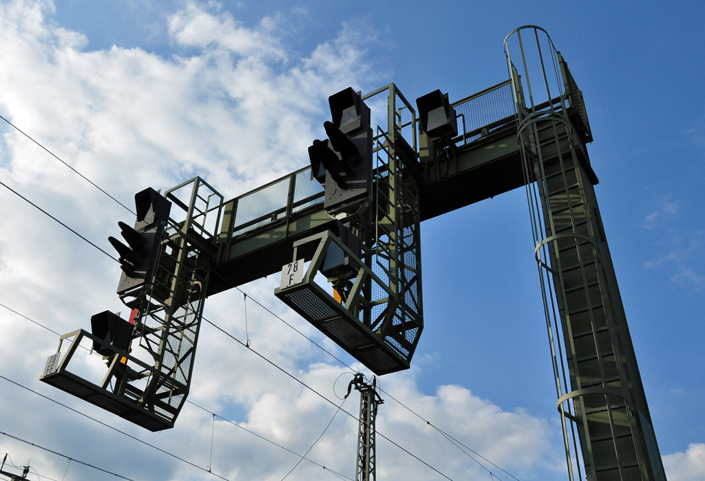 Ungewöhnlicher Standort für ein Flügelsignal. Zu sehen ist es in Aachen am Seffenter Weg, dort ist die Einfahrt zum Institut für Schienenfahrzeuge und Fördertechnik der RWTH Aachen (IFS). Im Hintergrund ist der Bahnhof Aachen West zu sehen. (08.11.2011)