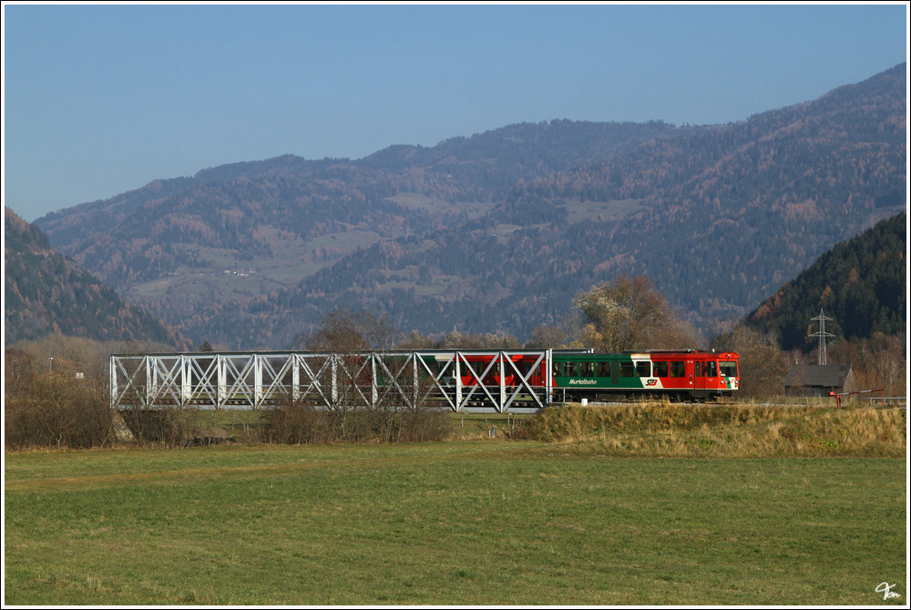 Über die Murbrücke nahe Teufenbach, fährt der Knotz Dieseltriebwagen VT 31 + VS 42 der Steiermärkischen Landesbahnen fährt als R 8709 von Unzmarkt nach Tamsweg.Die Murtalbahn ist die zweitlängste Schmalspurbahn Österreichs. 12.11.2011