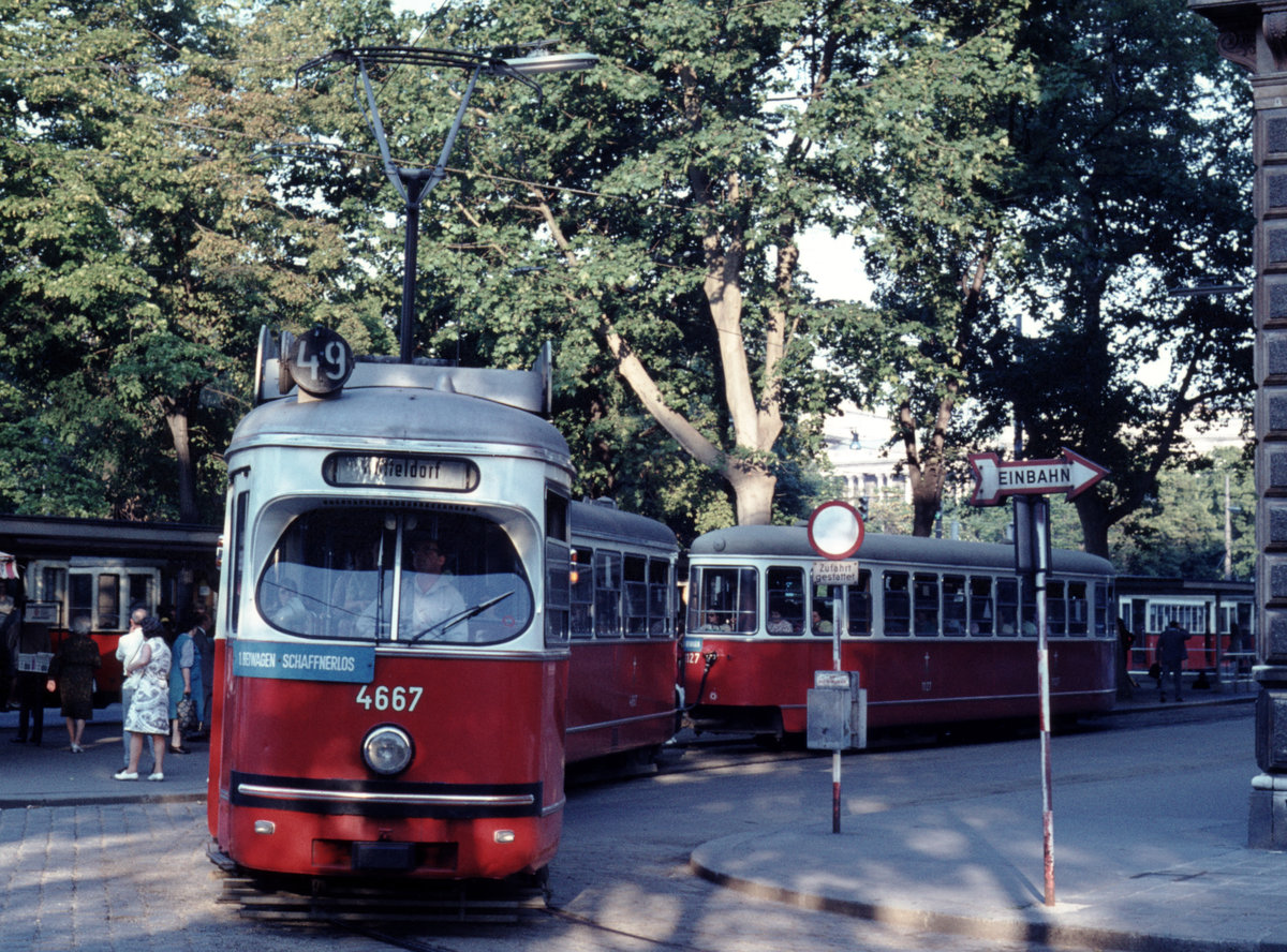 Wien Wiener Stadtwerke-Verkehrsbetriebe (WVB) SL 49 (E1 4667 (SGP 1967)) I, Innere Stadt, Dr.-Karl-Renner-Ring / Bellaria / Schmerlingplatz am 17. Juni 1971. - Scan eines Diapositivs. Film: Agfa CT 18. Kamera: Minolta SRT-101.
