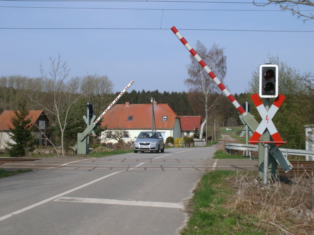 Dieser Bahnübergang befindet sich in der Nähe von Bergen/Rügen an der Hauptstrecke KBS 195.Aufnahme am 16.April 2011.