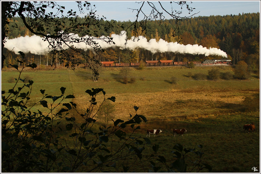 Nahe Benshausen entstand dieses Bild der Dampflok 50 3501 mit einem Fotogüterzug von Meiningen nach Zella-Mehlis - Plandampf Werratal. 29.10.2011