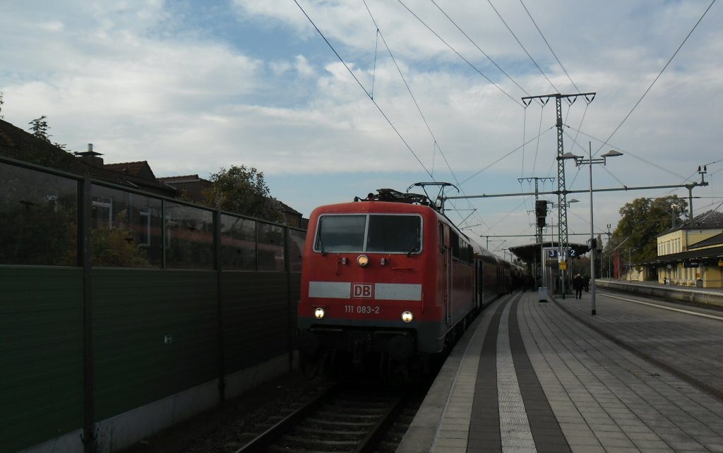 Die 111 077-4 mit einer weiteren im Schlepp zieht den RE9 von Aachen bis Köln Messe/Deutz am 20.11.2011