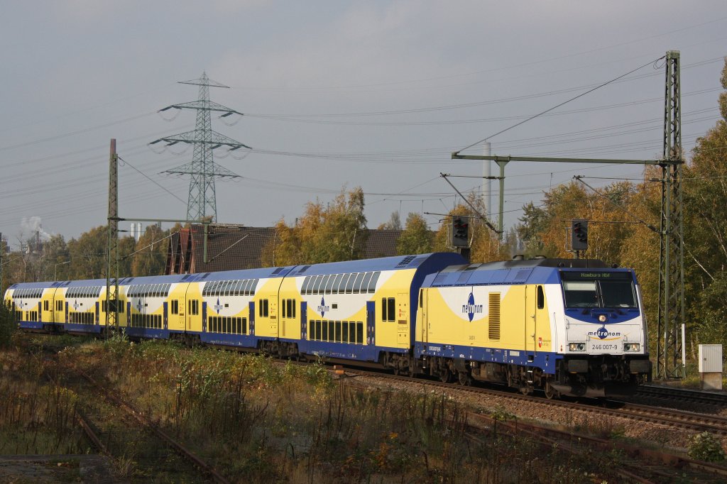 246 007 am 25.10.11 mit einem Metronom bei der Durchfahrt durch Hamburg-Unterelbe.