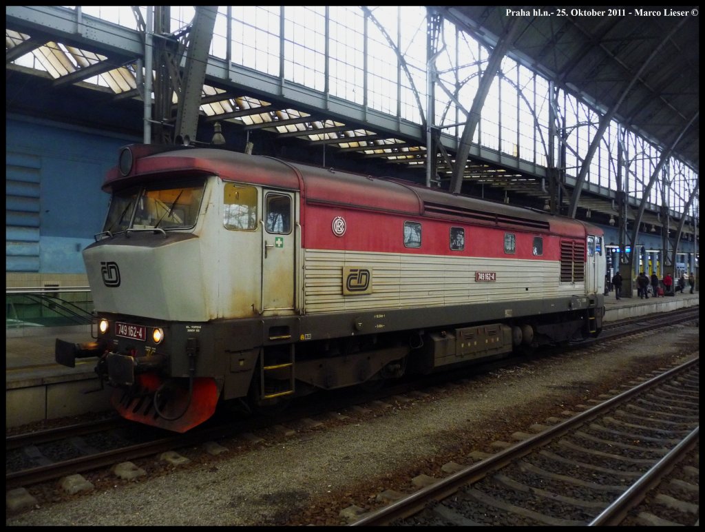 749 162 steht allein im Prager Hbf, nachdem sie von ihrem Personenzug abgekoppelt wurde (25.10.2011)