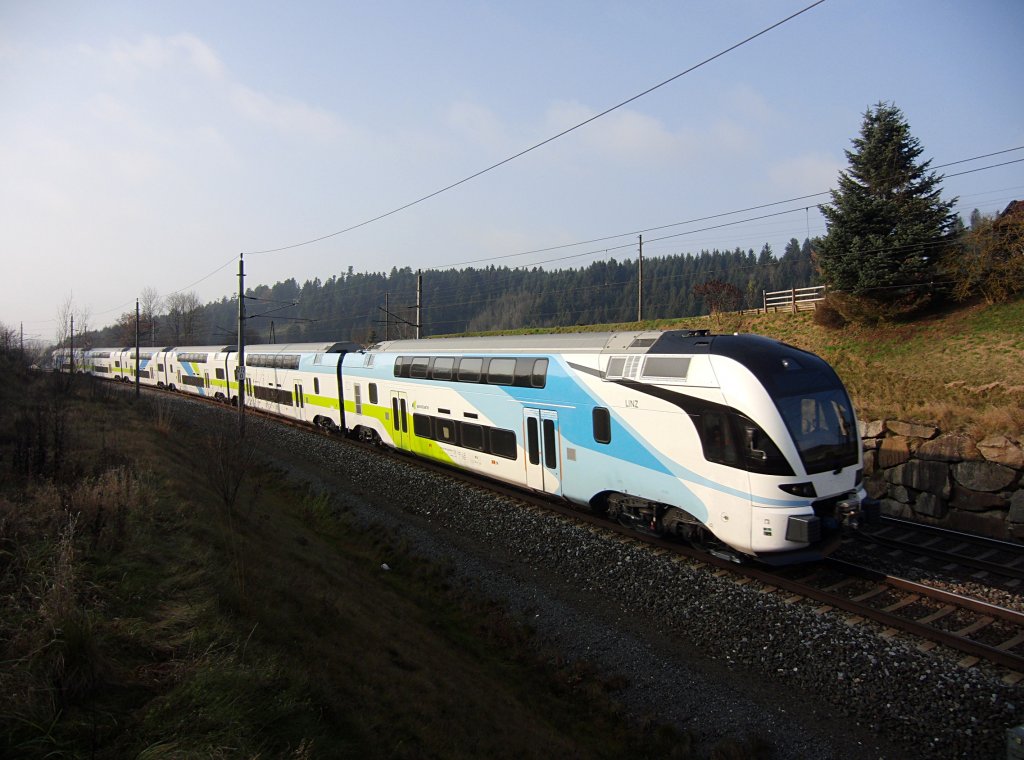 Der von der Stadler Altenrhein AG gebaute elektrische Doppelstock-Triebzug KISS der Westbahn GmbH am 11.11.2011 auf Testfahrt zwischen Pöndorf und Frankenmarkt in Fahrtrichtung Linz.