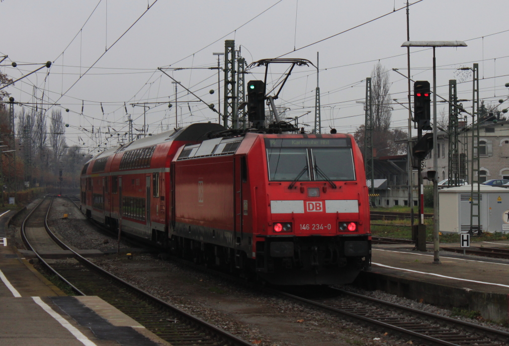 IRE nach Karlsruhe, aufgenommen hier bei der Abfahrt in Radolfzell. Typisch für diese Jahreszeit ist der Nebel, der den Bondensee überzieht (20.10.2011)
