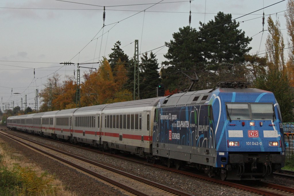 Die 101 042  Ecophantenn  (Tonnenweise CO2 sparen mit den ECO2Phnten/DB Schenker) zog am 2.11.11 den IC 2217 durch Düsseldorf-Angermund.