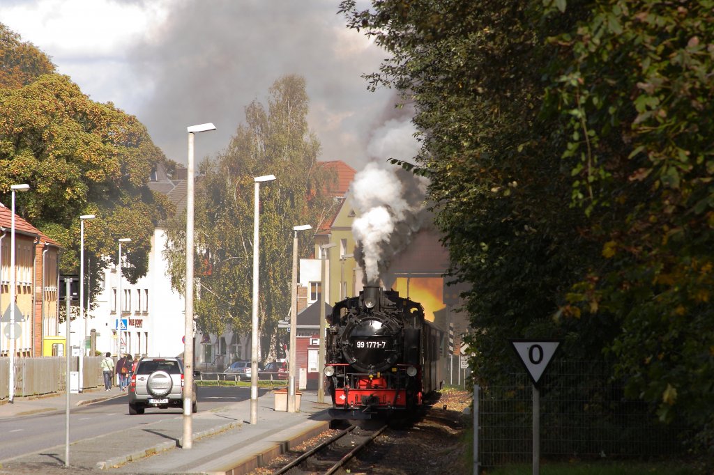 99 1771 hat am Nachmittag des 07.10.2011 soeben den Hp Freital-Coßmannsdorf verlassen und ist mit weit hörbaren Auspuffschlägen unterwegs auf der Steigung zur Einfahrt in den landschaftlich sehr reizvollen Rabenauer Grund!