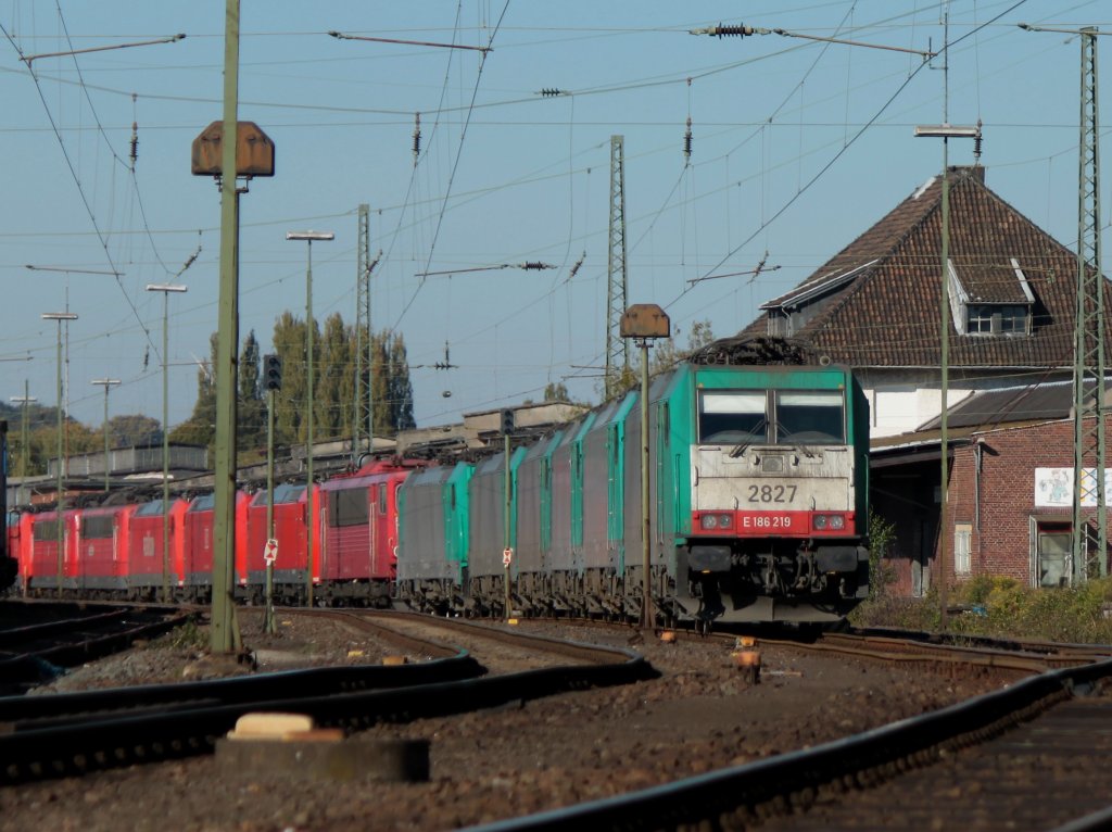 Sonntagsruhe in Aachen West. Die Cobras, angeführt von 186 219 (2827) stehen vor 151er, 155er und 185er am 16.10.2011 in Aachen West in der warmen Oktobersonne.