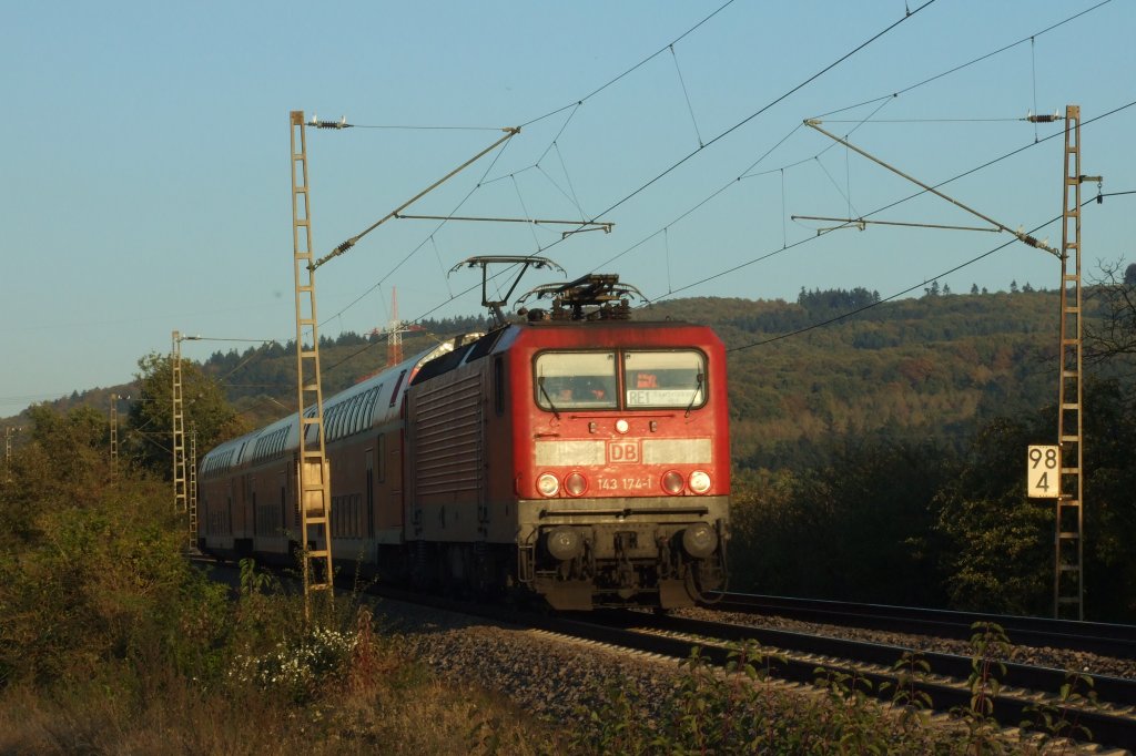 RE 12016, gezogen von 143 174, ist auf dem Weg nach Saarbrücken via Trier, hier kurz vor Schweich.