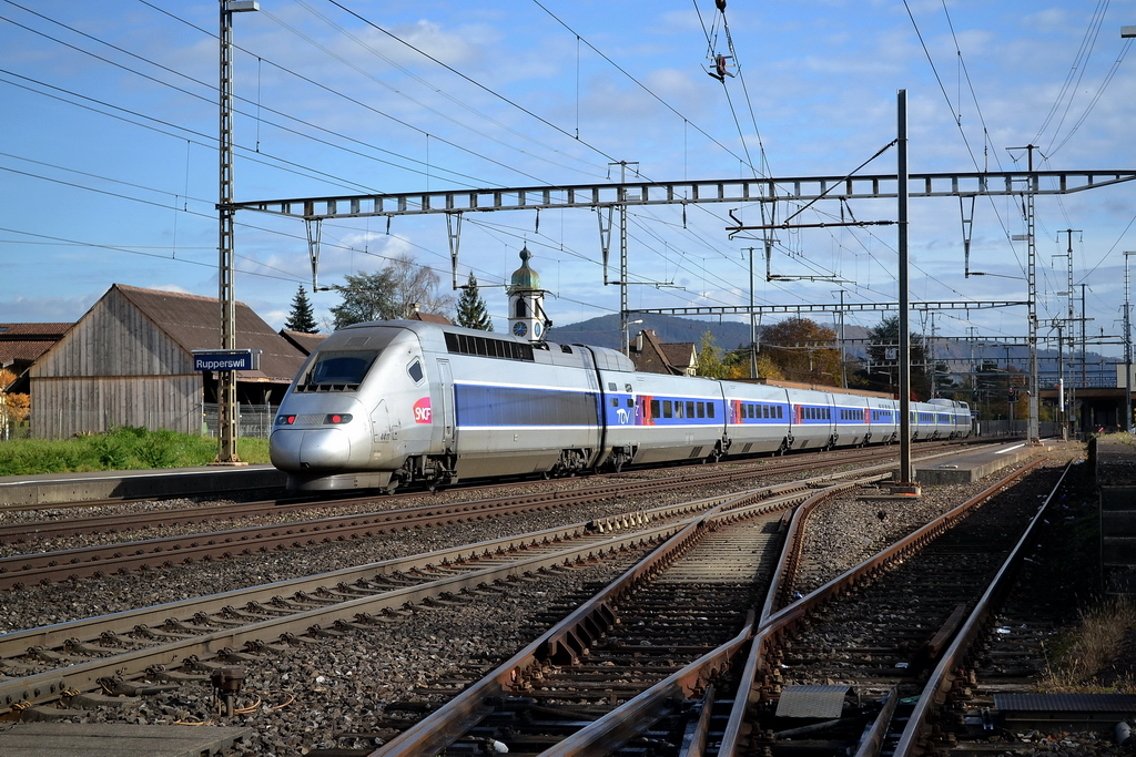 Der TGV 4411 hat es nicht mehr weit bis nach Zürich. Von Basel kommend fährt er ohne Halt durch in gut einer Stunde. Bhf. Rupperswil-Aargau am 26.10.2011.
