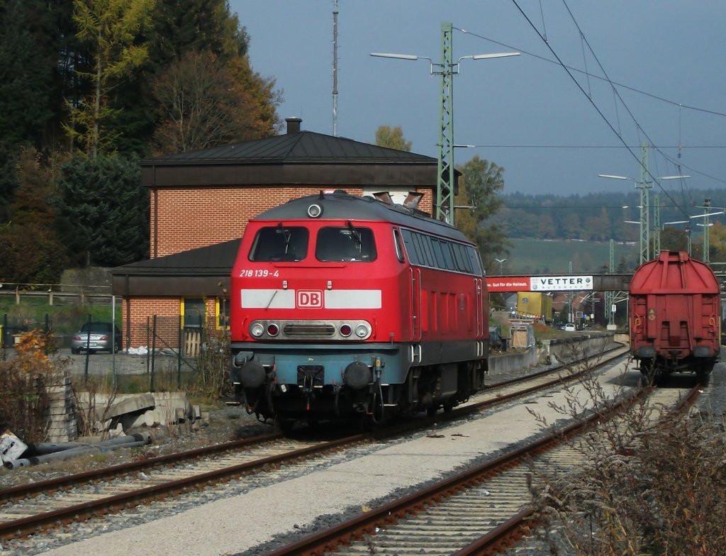 218 139-4 und ein Schiebewandwagen stehen am 28. Oktober 2011 auf den Gleisen 6 und 5 in Kronach abgestellt.