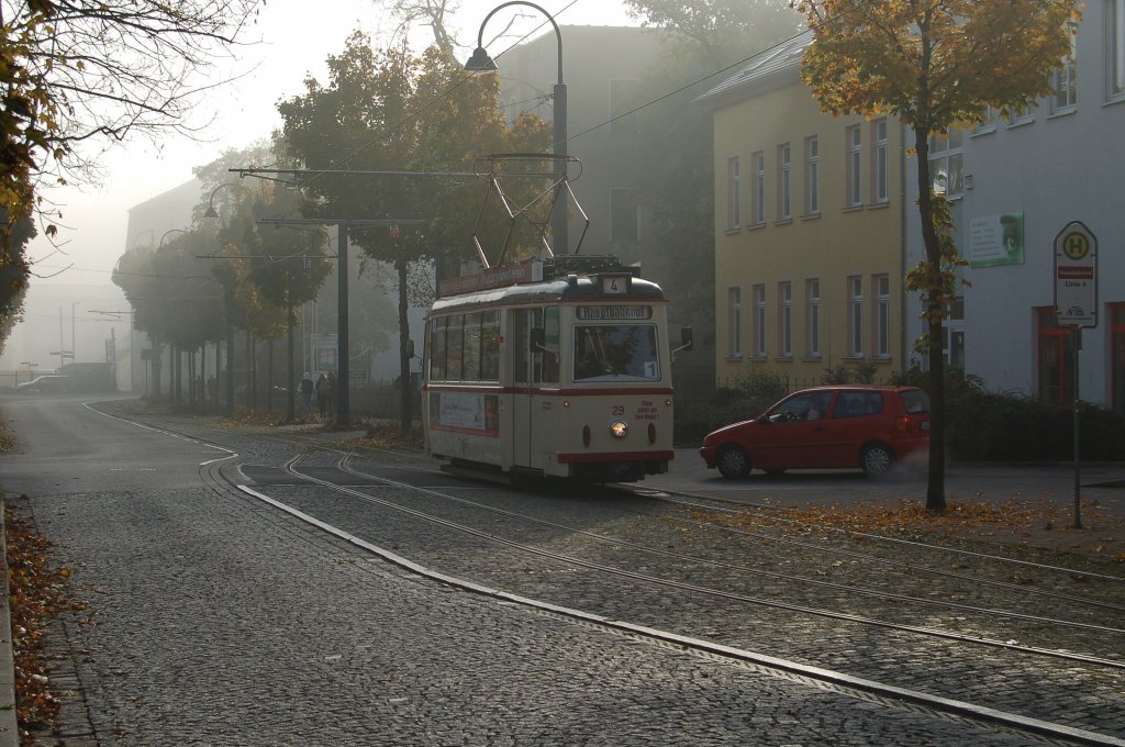 Wagen 29 der Naumburger Straßenbahn erreicht im Morgennebel die Endhaltestelle am Hbf. Der Wagen wird nach kurzem Auffenthalt wieder zurück zur Vogelwiese, dem zweiten Endpunkt der Strecke, fahren. 21.10.2011