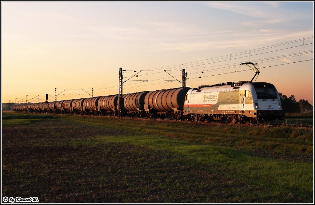 Im letzen Abendlicht kam 183 701  Train of Ideas  mit einem Kesselwagen gen Passau daher. (04.10.2011, Mangolding)