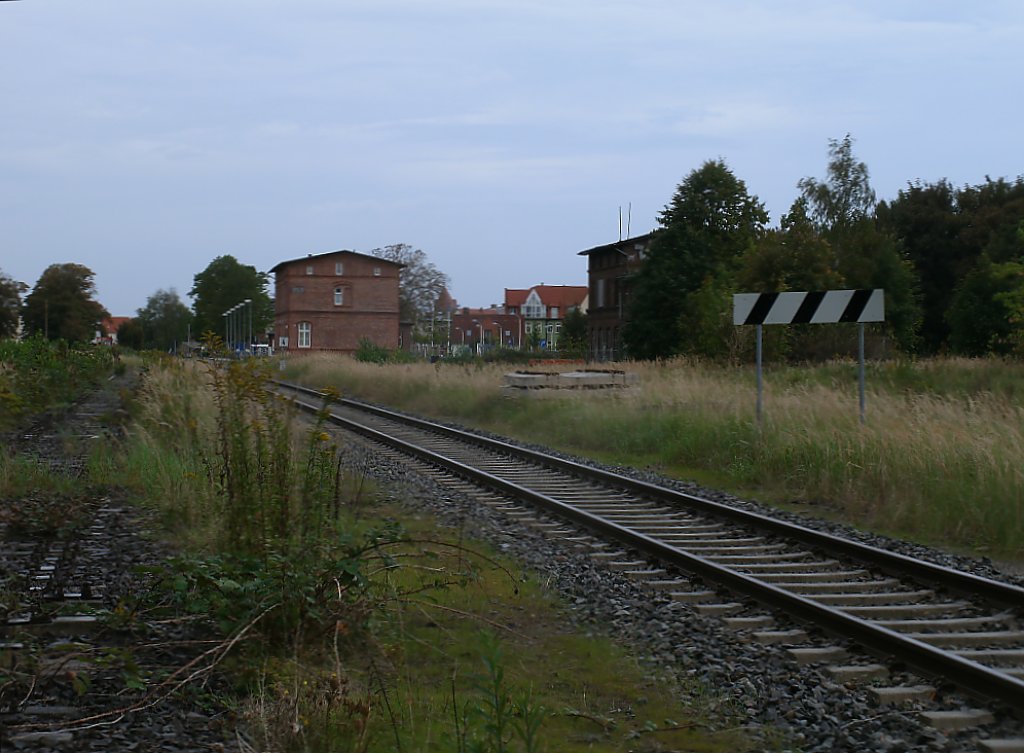 Das Streckenende in Barth in Richtung Bresewitz am 17.September 2011.Hinter dem Prellbock liegen zum Teil noch die Gleise bis zum eigentlichen Streckenende in Bresewitz vor der Brücke zum Darß.Geplant ist der Wiederaufbau der Darßbahn bis Prerow,bis 2016 will man erstmal bis Zingst fahren.
