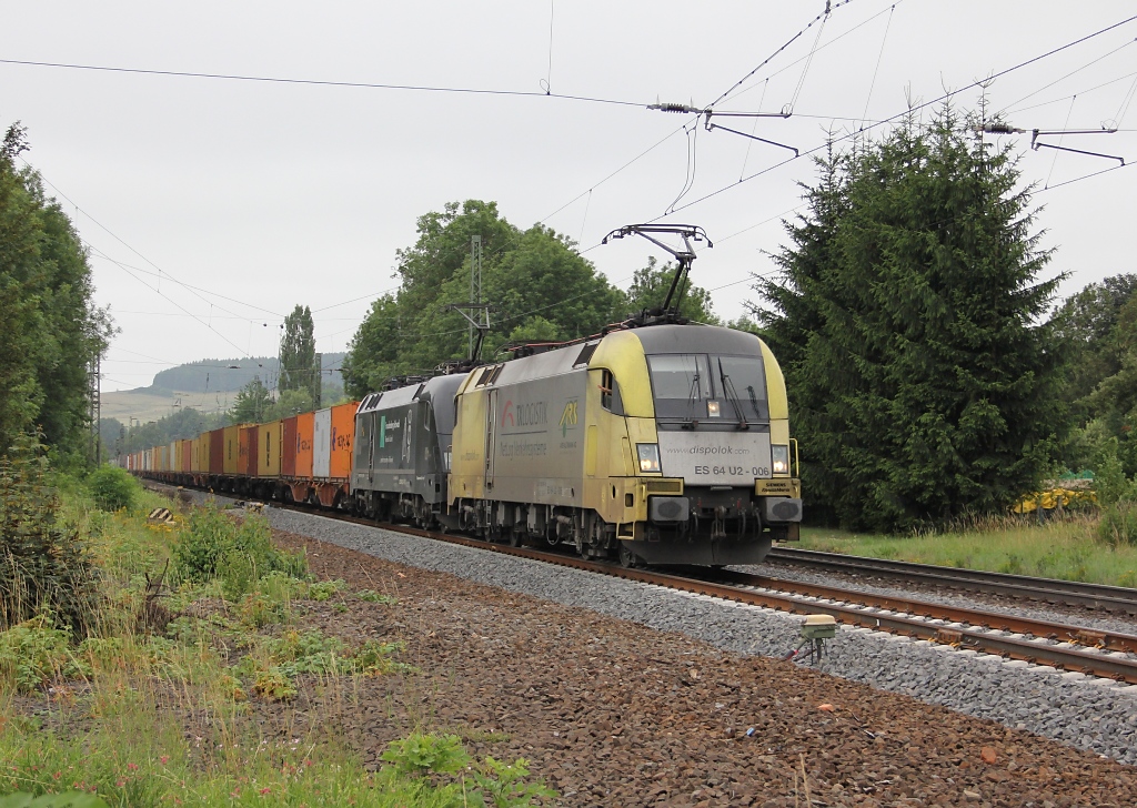 182 506-6 (ES 64 U2-006) und 182 573-6 (Es 64 U2-073) in Doppeltraktion vor einem Containerzug in Richtung Norden. Aufgenommen am 05.07.2011 am BÜ Eltmannshausen/Oberhone.