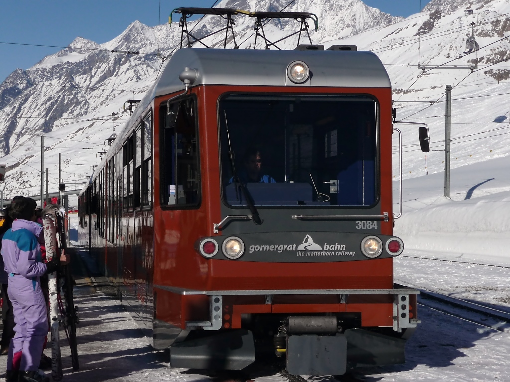 Die 3084 ist an ihrem Endpunkt auf dem Gornergrat angekommen, die Skifahrer haben den Bahnsteig fluchtartig verlassen, den Fotografen freut's... (16.3.2010)