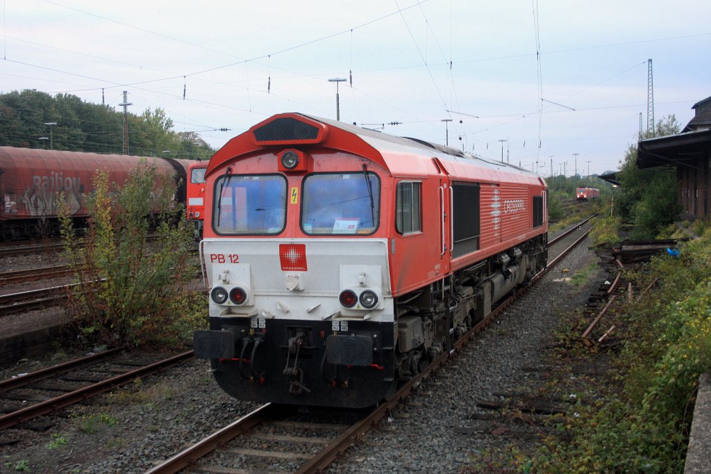 Die Class 66 PB12 "Marleen" von Crossrail steht abgestellt in Aachen-West bei Sonne und Wolken.