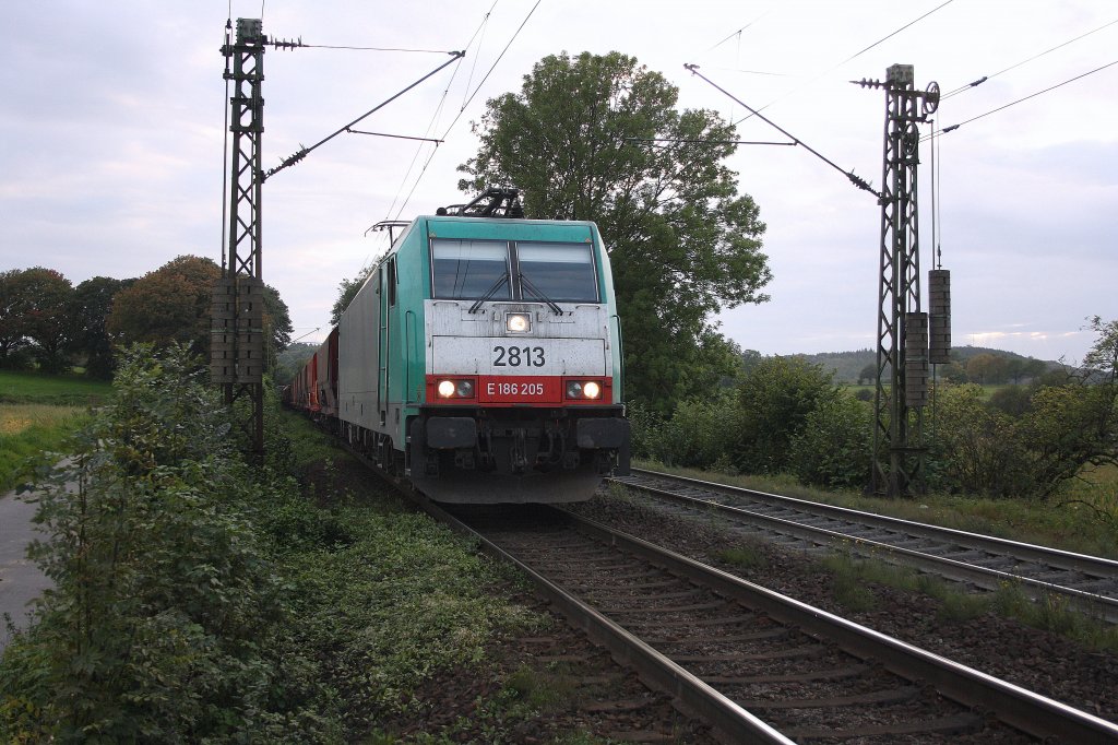 Die Cobra 2813 kommt mit einem Getreidezug aus Belgien und fährt nach Aachen-West bei Sonne und Wolken. Aufgenommen am Gemmenicher-Weg. 22.9.2011