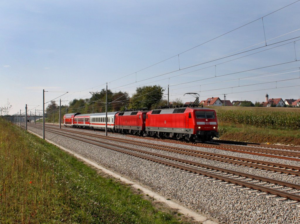 Die 120 135 und die 120 120 am 24.09.2011 mit einem PBZ unterwegs bei Hattenhofen.