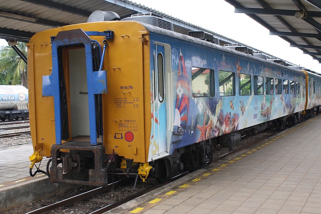 Im buntem Werbedesign zeigt sich der บจพ.ป.111 (บจพ.ป. =ARS/Air-Conditioned Reserved Saloon) am 11.Juni 2011 in der Pak Chang Station.