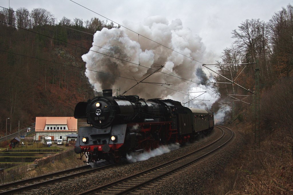 03 1010 ist am 31.03.'12 mit einem Sonderzug vom Dresdner Dampfloktreffen nach Klingenberg-Colmnitz unterwegs. Aufgenommen wurde sie bei der Bergfahrt an der Tharandter Rampe nahe Edle Krone.