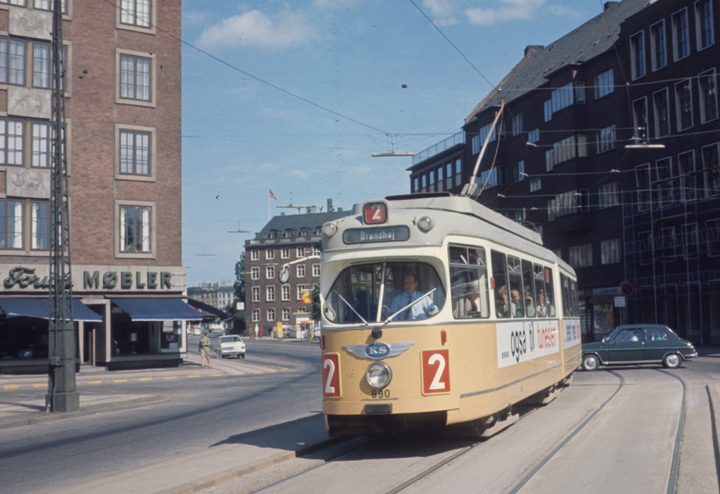København / Kopenhagen Københavns Sporveje SL 2 (DÜWAG/Kiepe-GT6 890) København V / Frederiksberg, Rosenørns Allé / Julius Thomsens Gade / Danmarks Radio-Radiohuset (Dänischer Rundfunk) / Forum im Juni 1969. - Scan eines Diapositivs.