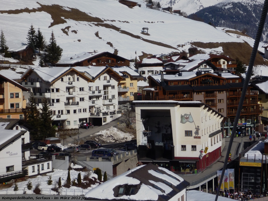 Talstation der klassischen Komperdellbahn in Serfaus, photographiert aus einer Gondel der weniger klassischen Alpkopfbahn. Die alte Komperdell-Pendelbahn steht regelmäßig (wöchentlich) in Betrieb und wirkt, gerade auch was die schönen, klassischen Masten betrifft, höchst gepflegt. Leider war ich am falschen Tag am richtigen Ort. Im März 2012 kHds