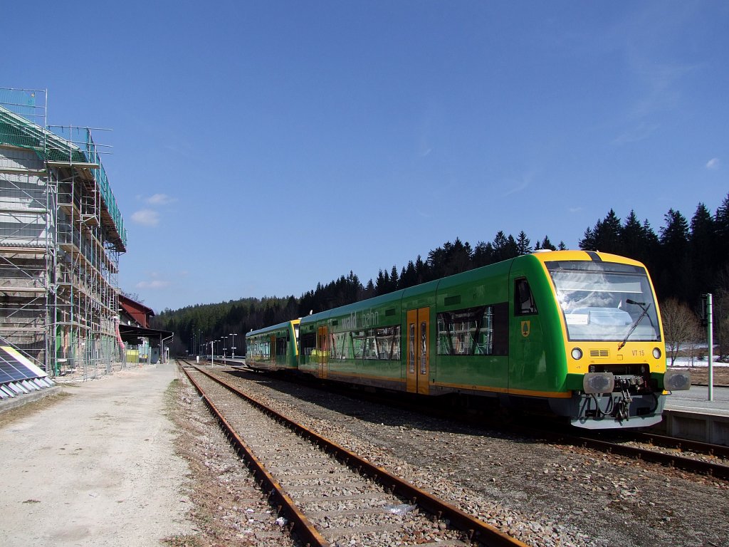 VT15 "Viechtach", sowie VT23 "Gotteszell" warten im Bahnhof Bayerisch-Eisenstein, welcher dzt. im Zuge eines EU-Förderprojektes Generalsaniert wird, als RB 5394 auf die Abfahrt; 120328