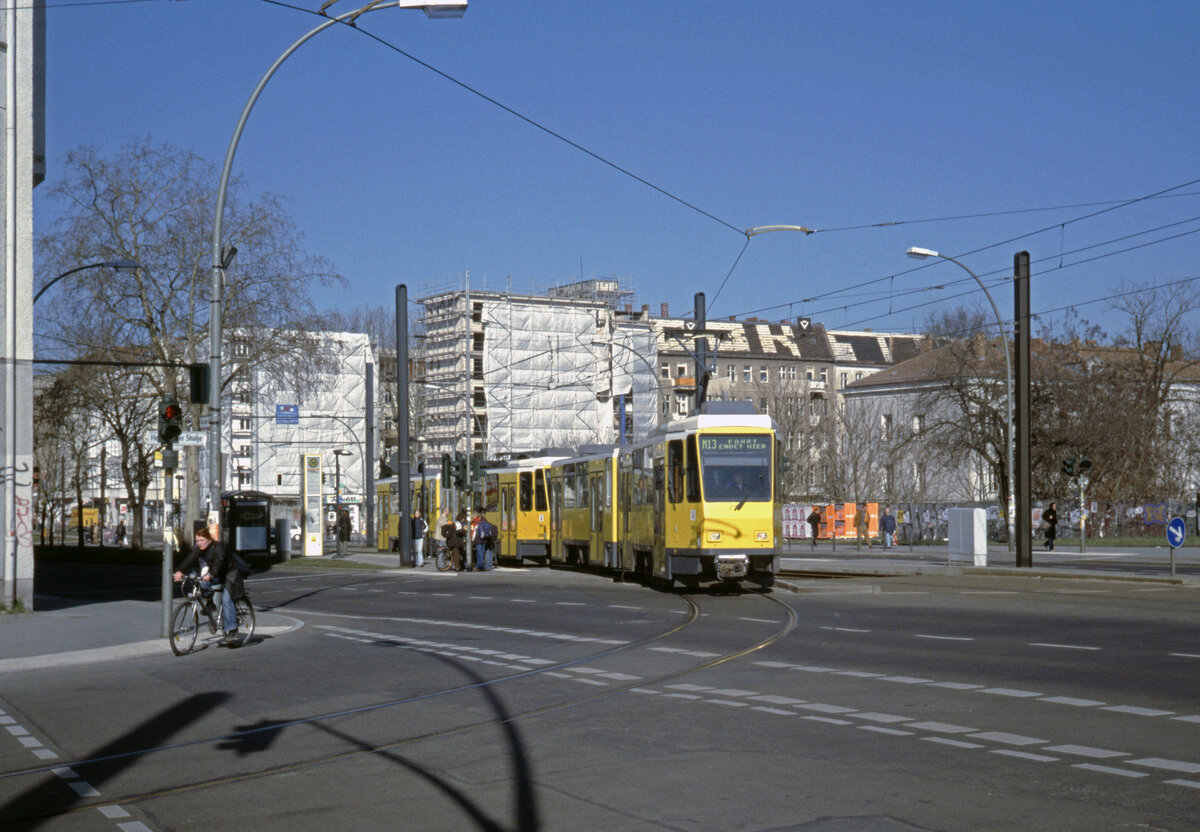 Berlin BVG SL M10 (GT6-99ZR 2036) Friedrichshain, Warschauer Straße / Helsingforser Straße / S-Bf Warschauer Straße im März 2005. - Scan eines Diapositivs. Film: Kodak Ektachrome ED 3. Kamera: Leica CL.