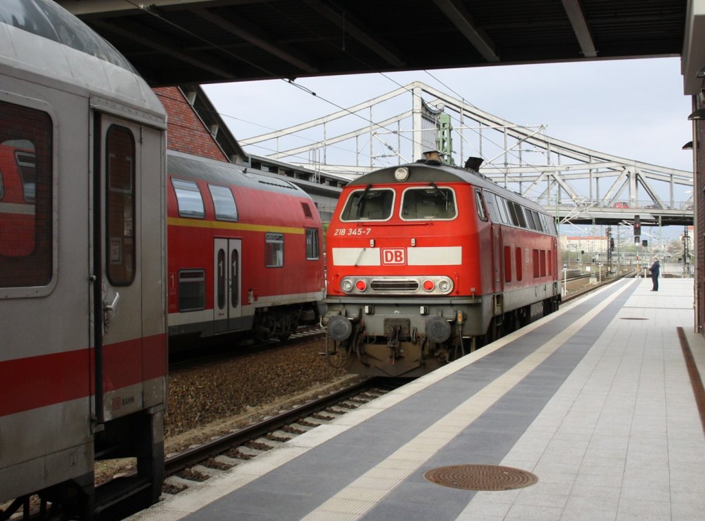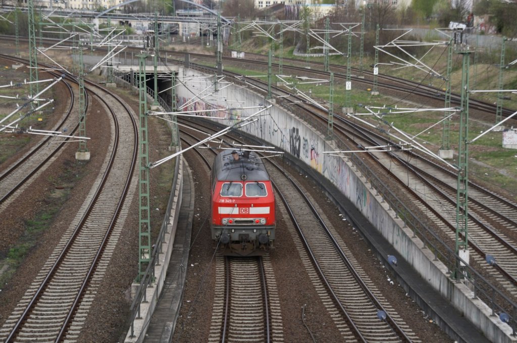 15.4.2012 Berlin-Gesundbrunnen. 218 345-7 - vor kurzem als Schlusslok mit IC 2427 angekommen - auf dem Innenring, durchfährt gleich die Überführung der Stettiner Bahn.