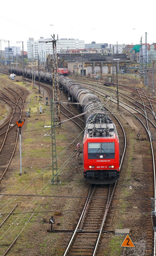 482 037-9 ,vermietet an Infra Leuna, mit Kesselzug am 10.04.2012 in Halle/S., Berliner Brücke.