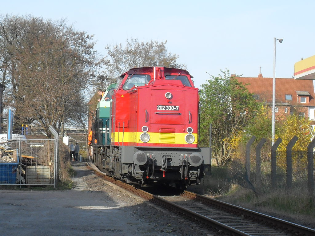 Am 15.04.2012 fuhren die 203 318 (DR 110 318;Umbau in 112 318;DB 202 318)e.g.o.o. Eisenbahngesellschaft Ostfriesland-Oldenburg mbH mit der 202 330 (DR 110 330;Umbau in 112 330;DB 202 330)Eisenbahnbetriebsgesellschaft Mittelrhein - EBM Cargo GmbH in das RAW Stendal.