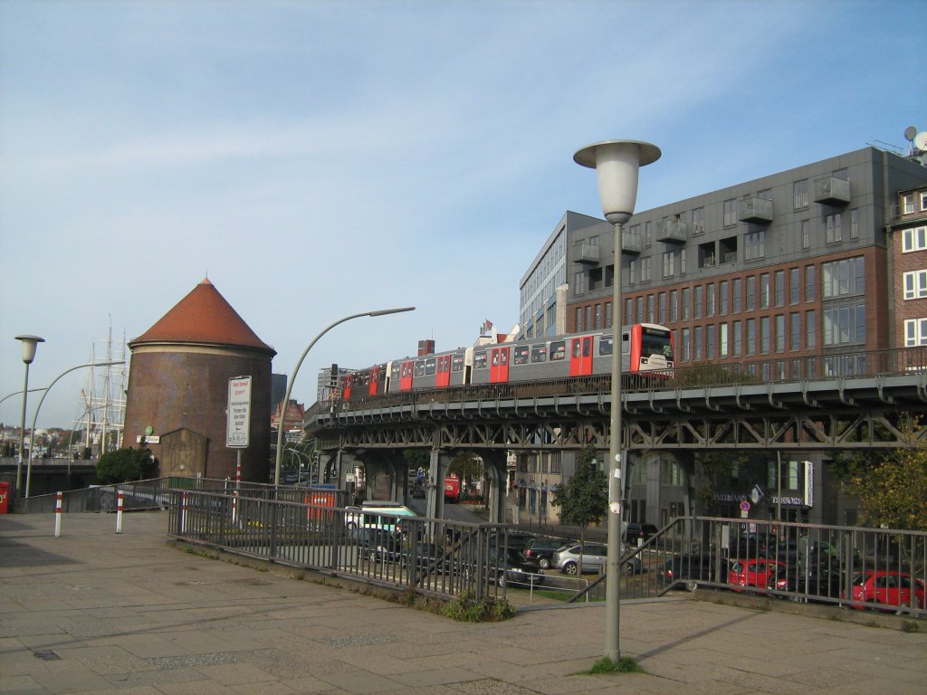 Parallelfahrt eines DT3-Zuges auf der U3 und eines DT4-Zuges auf der U1 kurz vor der Haltestelle Eppendorfer Baum. Nur die Bahn der U3 wird hier anhalten, die U1 wird dagegen gleich in einen Tunnel verschwinden.