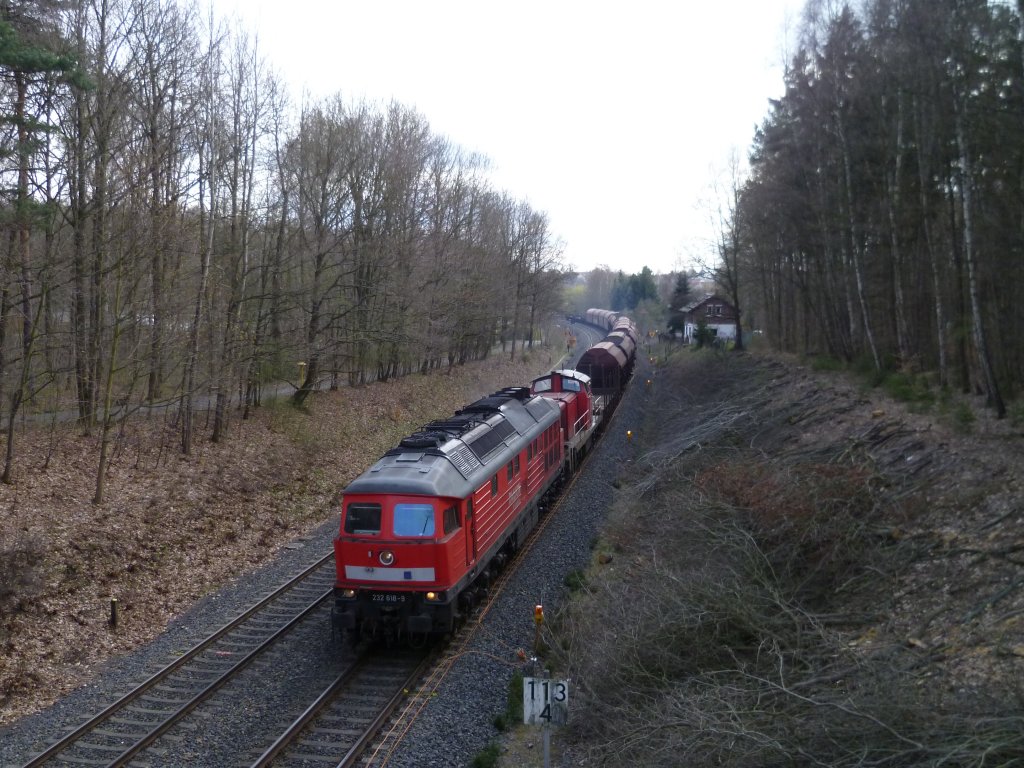 Am 11.04.12 werden die beiden hvle-V 100 von einer MEG-155 überholt. MEG-701 zog ihren Zementzug durch den Bahnhof Hohen Neundorf West Richtung Karower Kreuz.