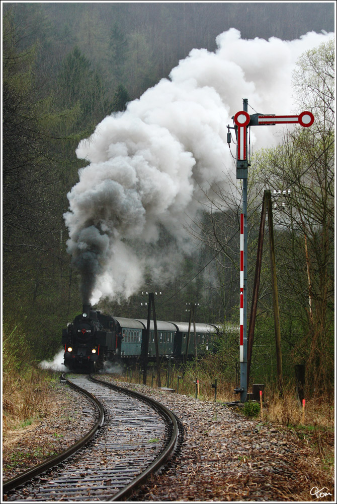 Anlässlich der Streckenübernahme durch die Traisental-Gölsental GmbH, gab es am 15.4.2012 den Nostalgiesonderzug SR 14602 von St.Pölten Hbf nach St. Aegyd am Neuwalde. Gezogen wurde dieser Zug von der 93.1420, hier zu sehen beim Formsignal nahe Freiland.