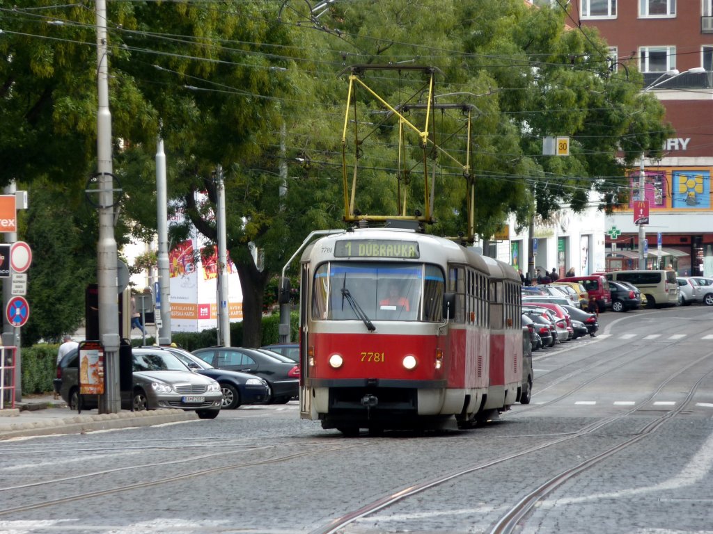 Eine Starßenbahn der Linie 1 fährt am 11.10.2011 durch die Innenstadt Bratislavas.