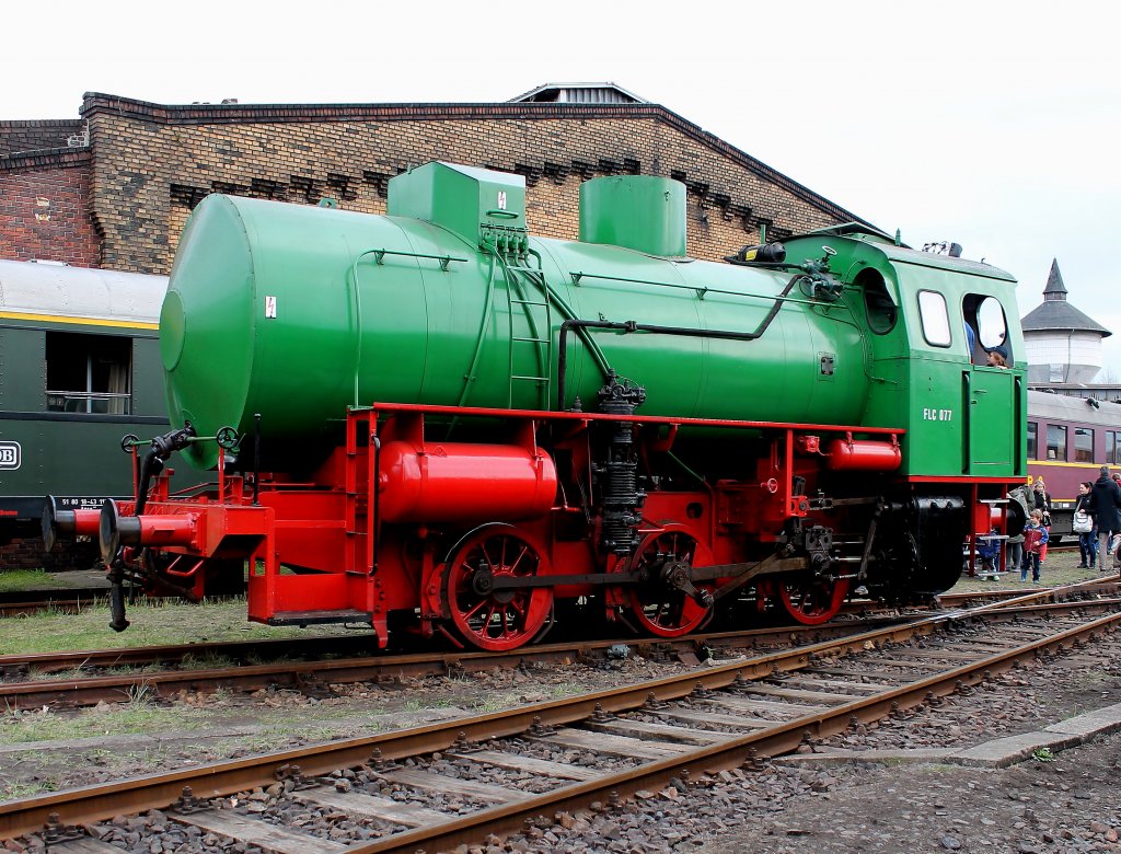 Frühlingsfest im Bw Berlin-Schöneweide am 15.04.2012. Die Dampfspeicherlokomotive FLC 077 der Berliner Dampflokfreunde e. V. ist für Führerstandsmitfahrten mit Dampf befüllt.