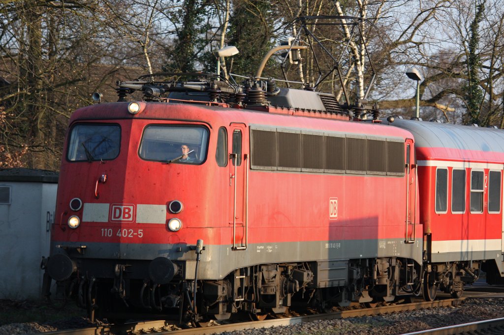 110 402 fuhr am 22.3.12 mit einem umgeiteten RB 35 Verstärker durch Ratingen-Lintorf.