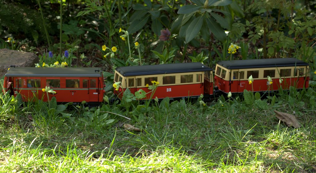 Hier ist deutlich der Wismarer Triebwagen zu sehen der mit VB und TV 133 durch den Primelwald der "Primelbahn" fährt. Pflanzen breiten sich ja oft längs von Bahnstrecken aus, hier sind es allerdings die Ameisen die den Samen der Primel längs der Bahnstrecke verbreiten.