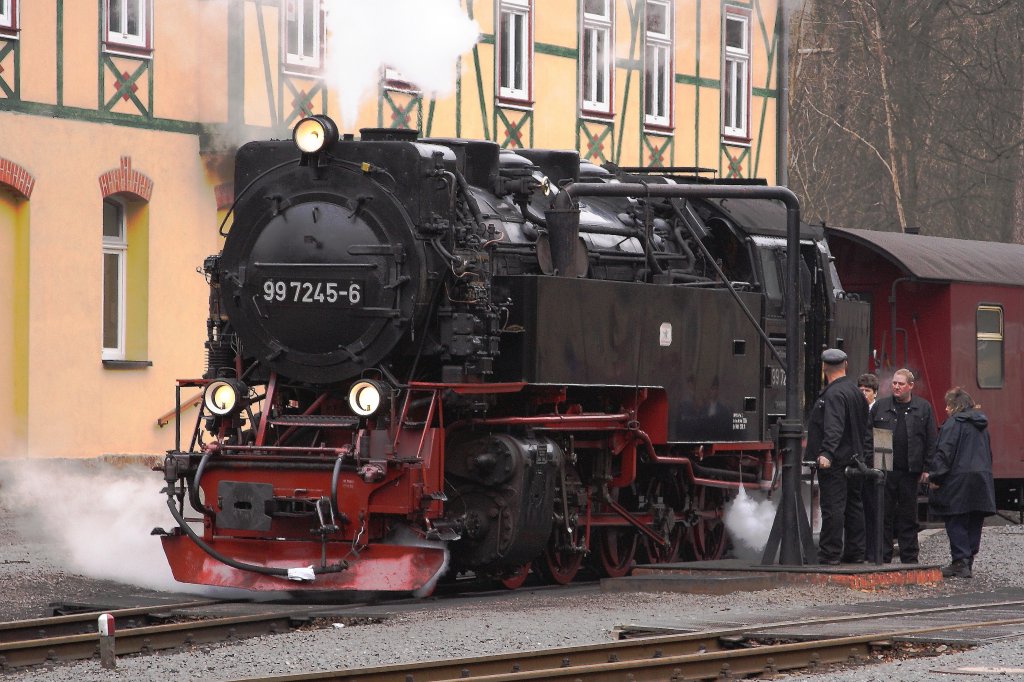 99 7245 mit P 8929 am 06.04.2012 im Bahnhof "Eisfelder Talmühle". Der Schieber vom Wasserkran wird gerade geschlossen und nachdem kurz darauf der Gegenzug aus Nordhausen eingelaufen ist, kann die Fahrt mit frischer Kraft fortgesetzt werden!
